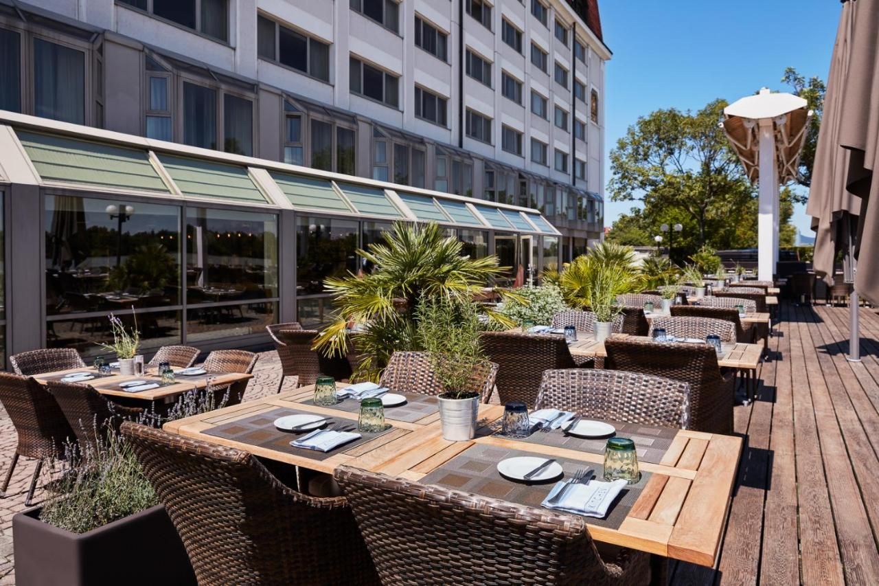 The extremely spacious rooms feature large work desks, 37-inch LCD flat-screen TVs and air conditioning. They offer views of the city or the Danube.